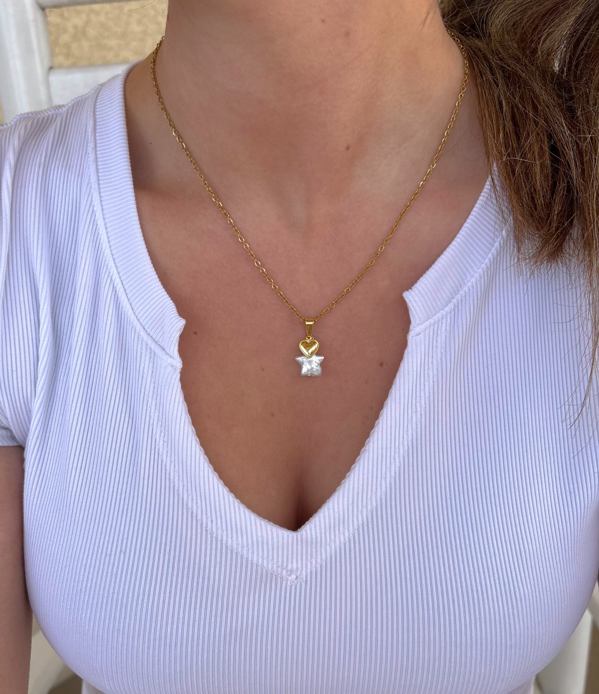 freshwater pearl star & heart double charm necklace with stainless steel chain 18in. Freshwater pearls will vary in size, shape, and slightly in color. No two pearls are the same and may have “imperfect” aspects about them. PLEASE see the last slide for how your pearl can look!