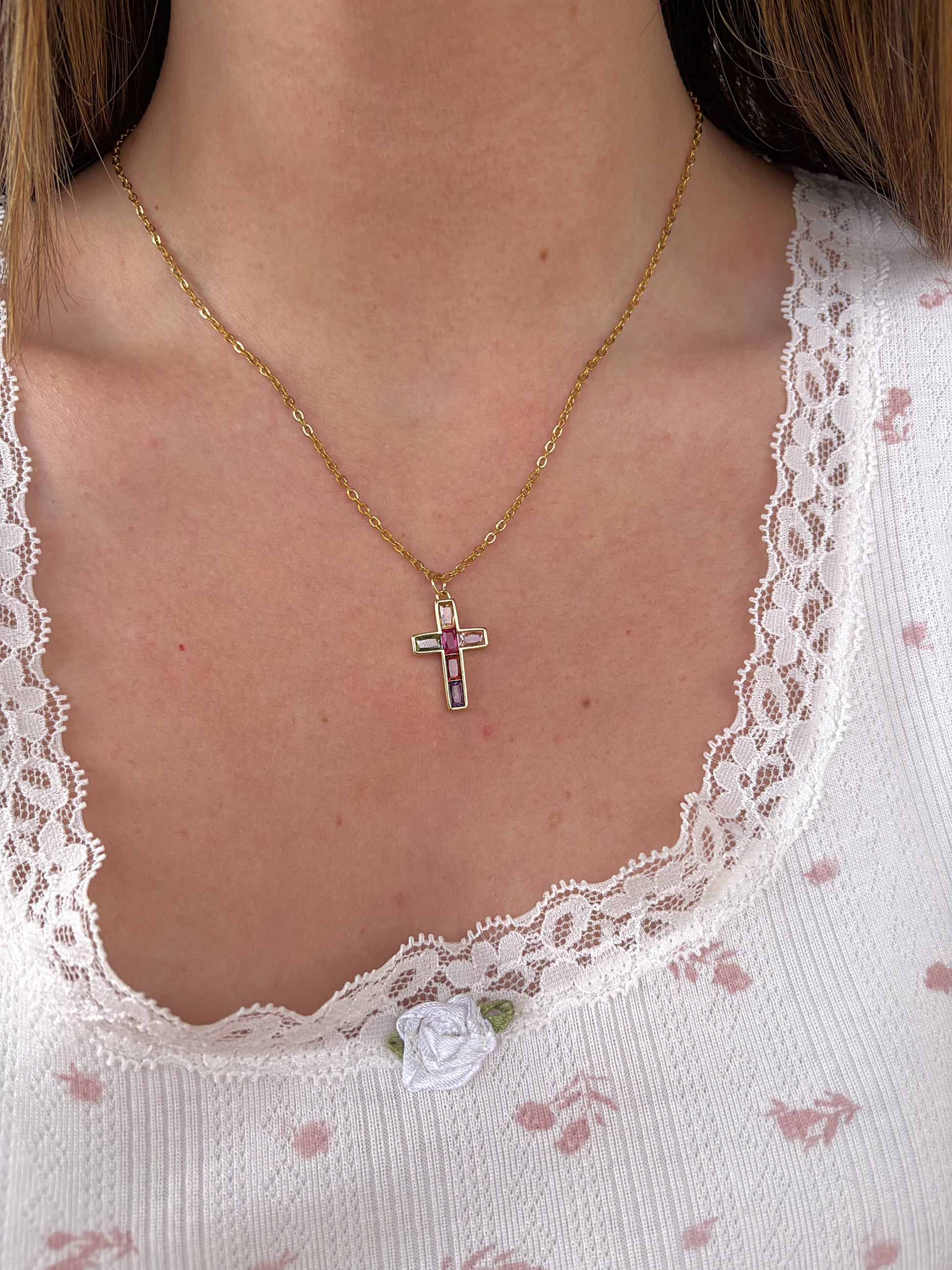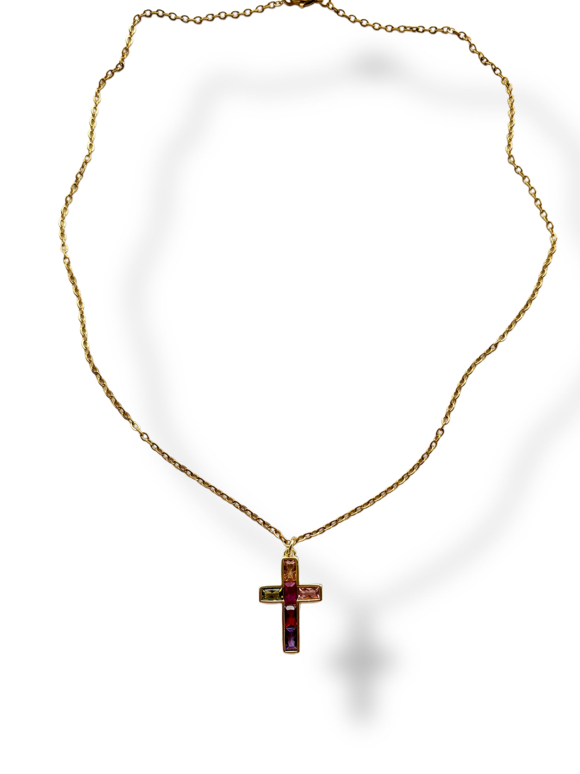 18K Gold Filled & multi color Cubic Zirconia charm on stainless steel chain 18in