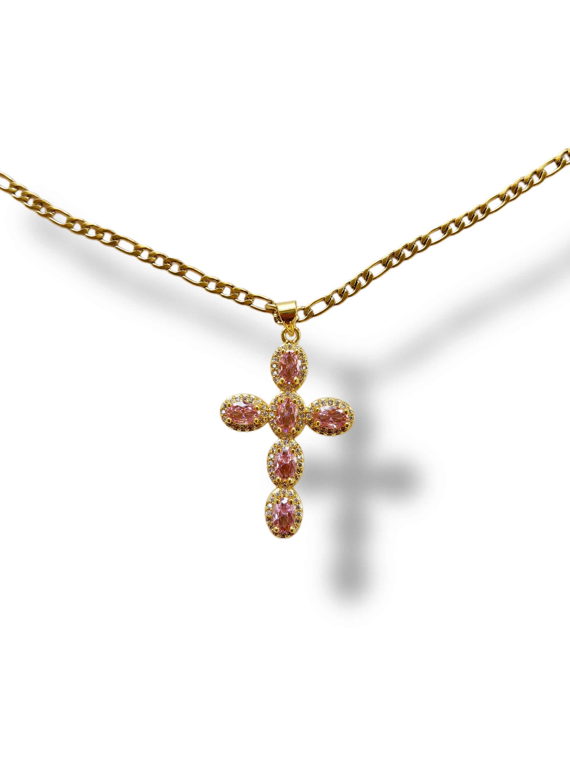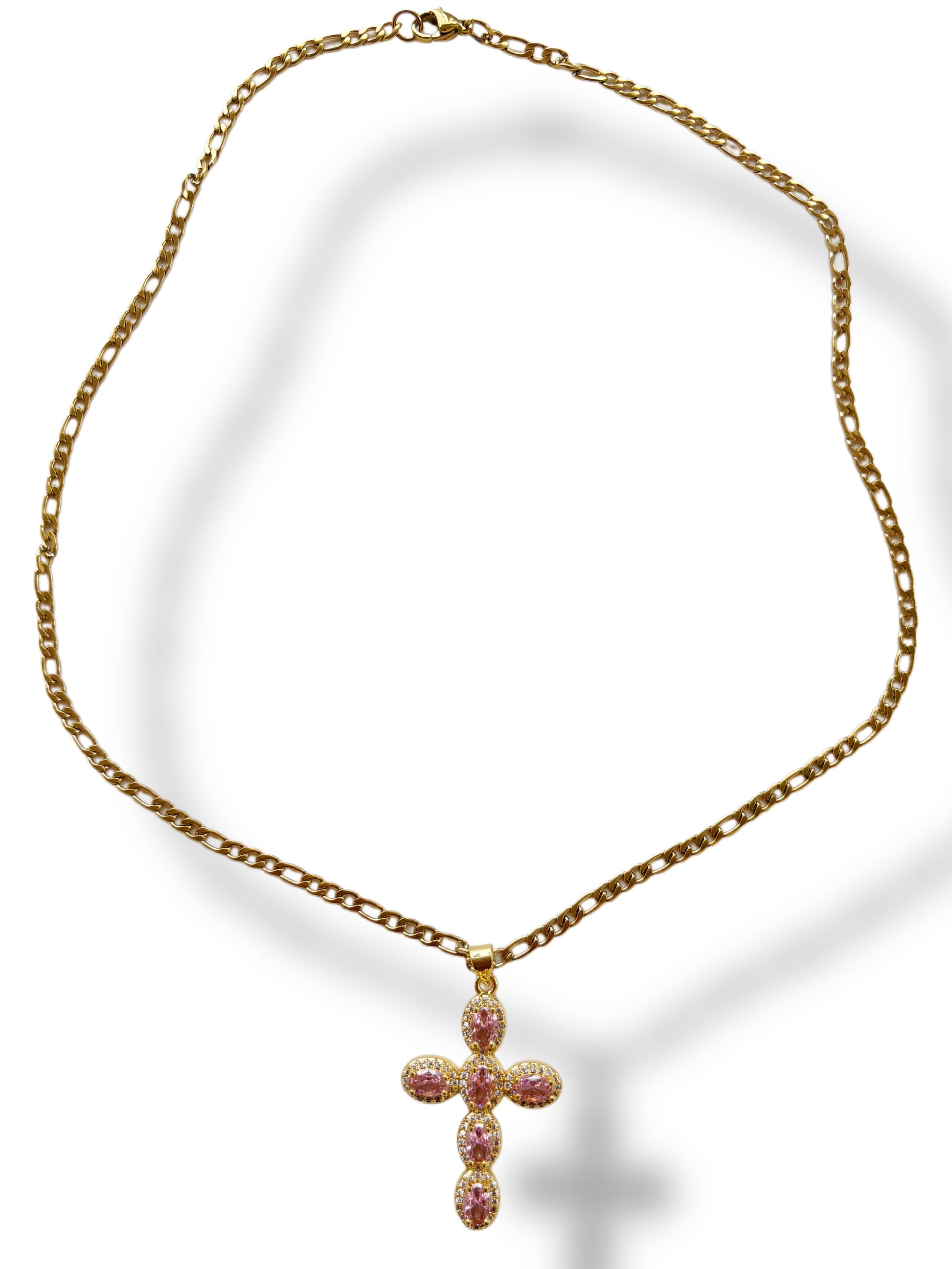 Large 14k gold filled & pink cubic zirconia cross charm on 18in stainless steel figaro chain!