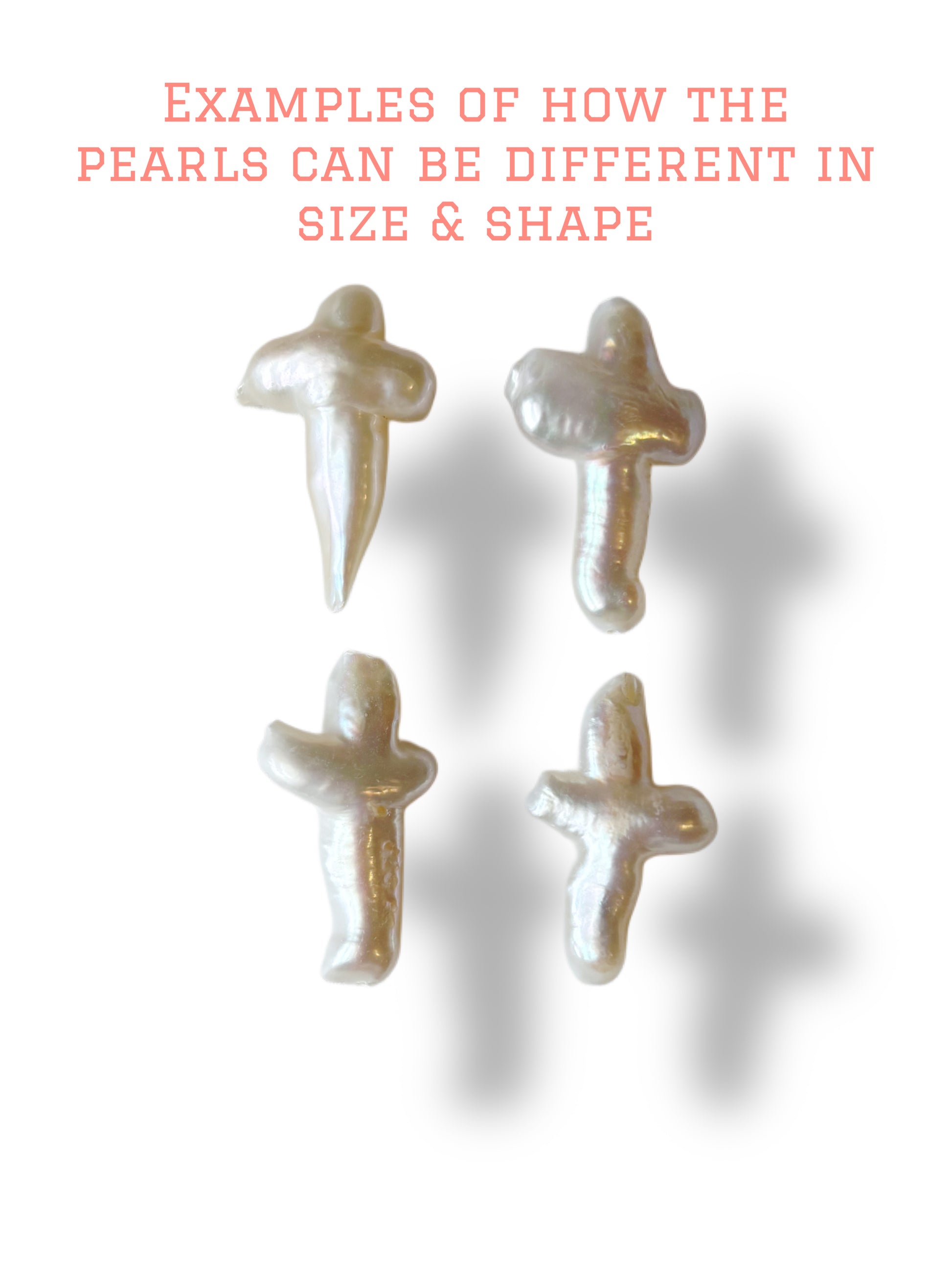 Large freshwater Pearl cross on an 18in stainless steel chain. The pearl can vary in size & shape or have an “imperfect” cross look because the pearl forms naturally in an oyster this way! One side of the pearl can have a longer end than the other.