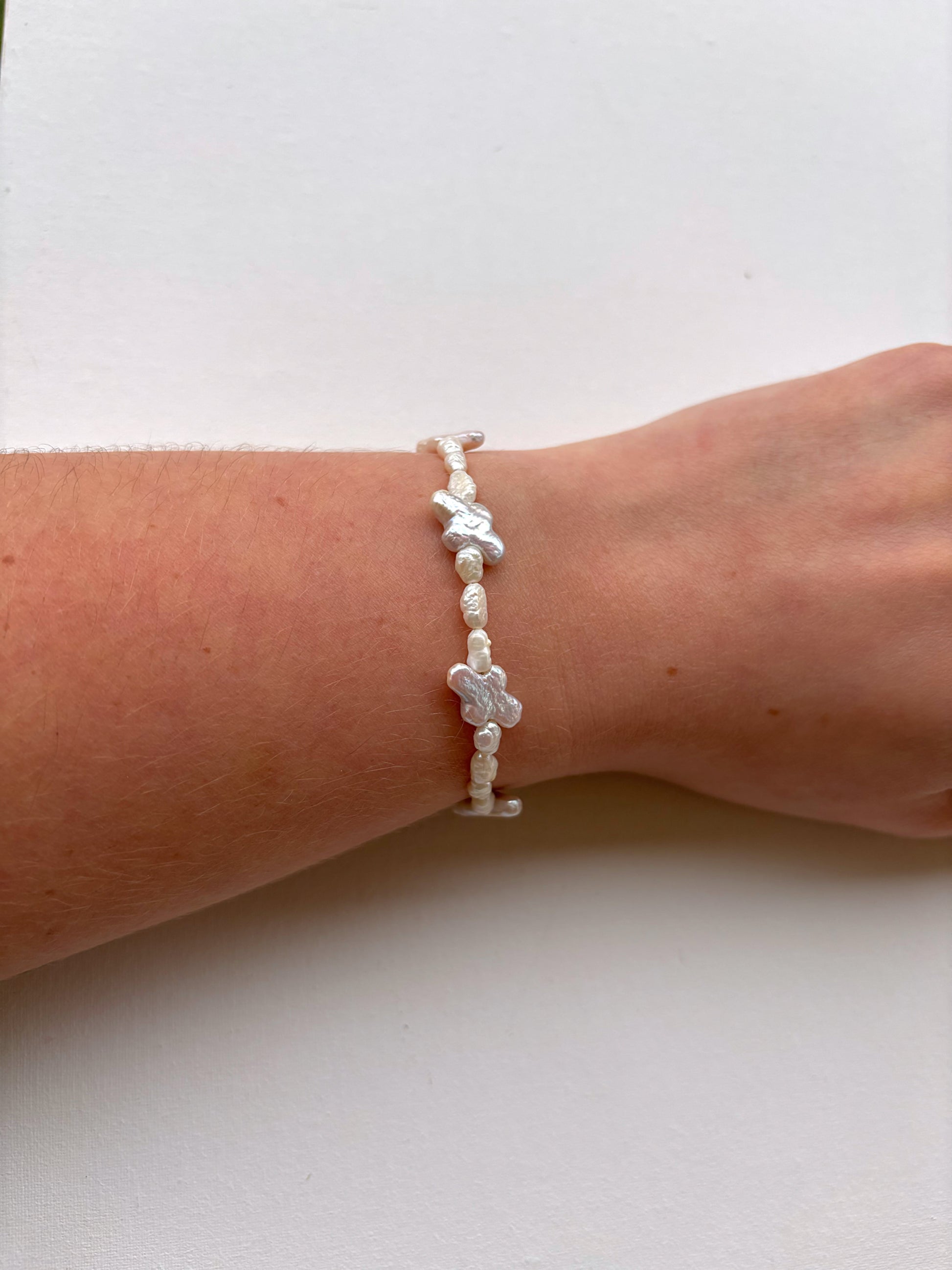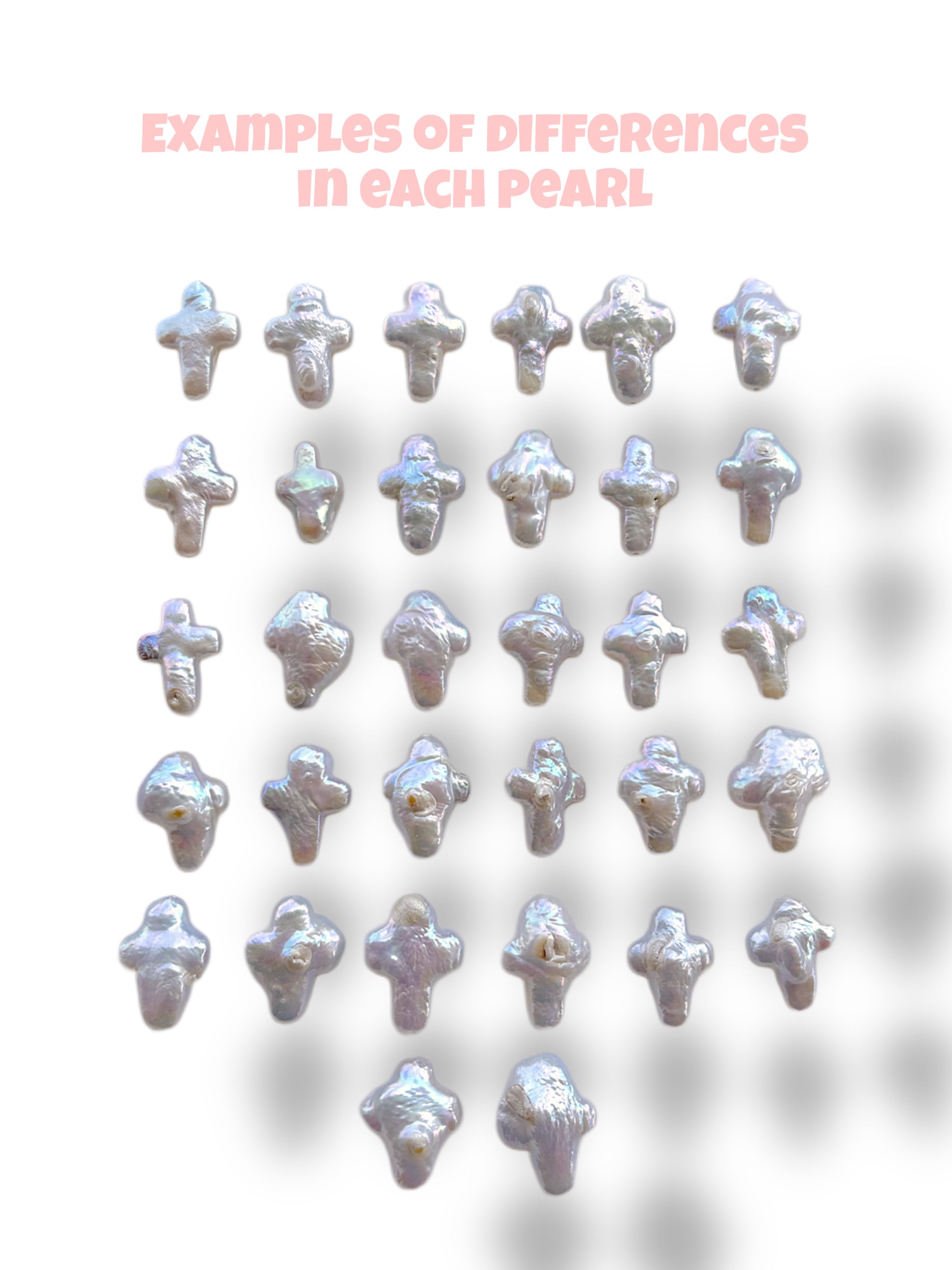 Authentic freshwater Pearl beads. Stainless steel findings. The pearl crosses can vary in size & shape or have an “imperfect” cross look because the pearl forms naturally in an oyster this way! Please see the last slide for how each pearl can vary in look!