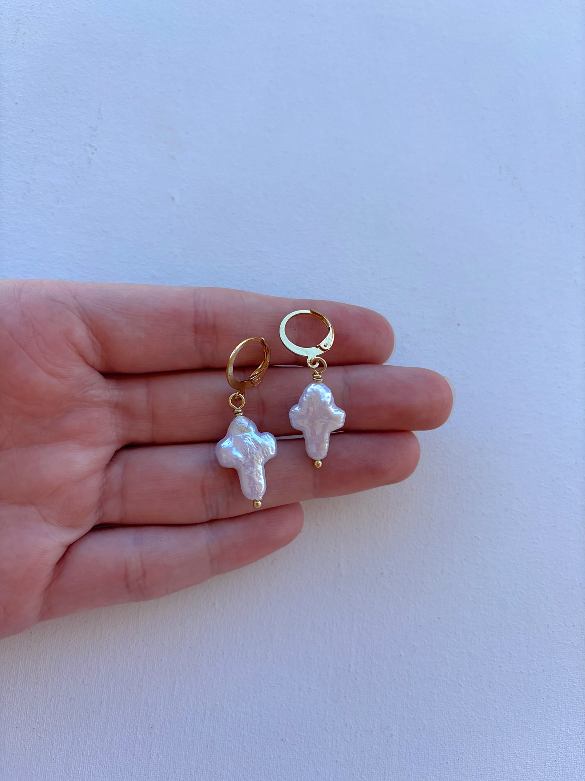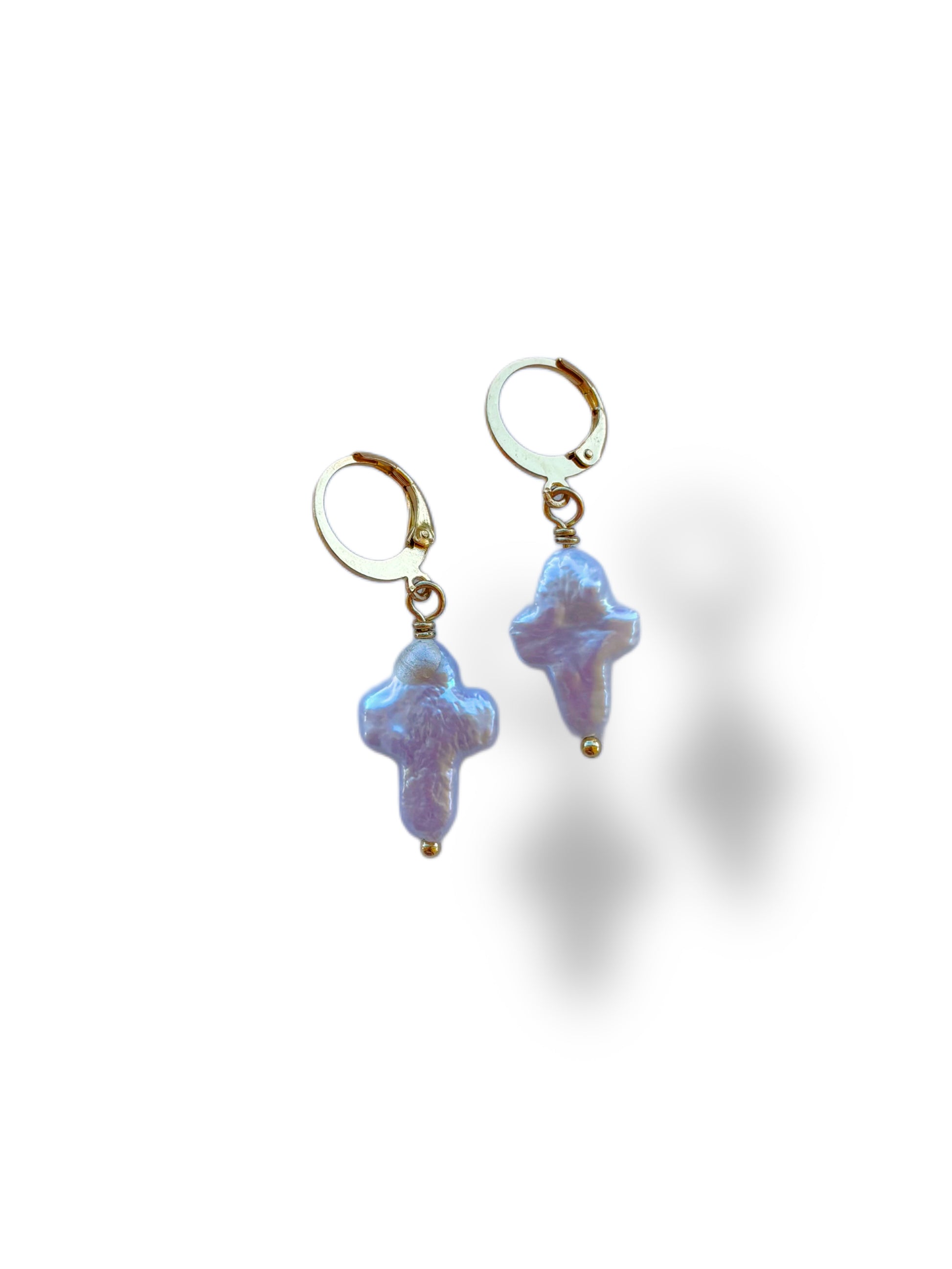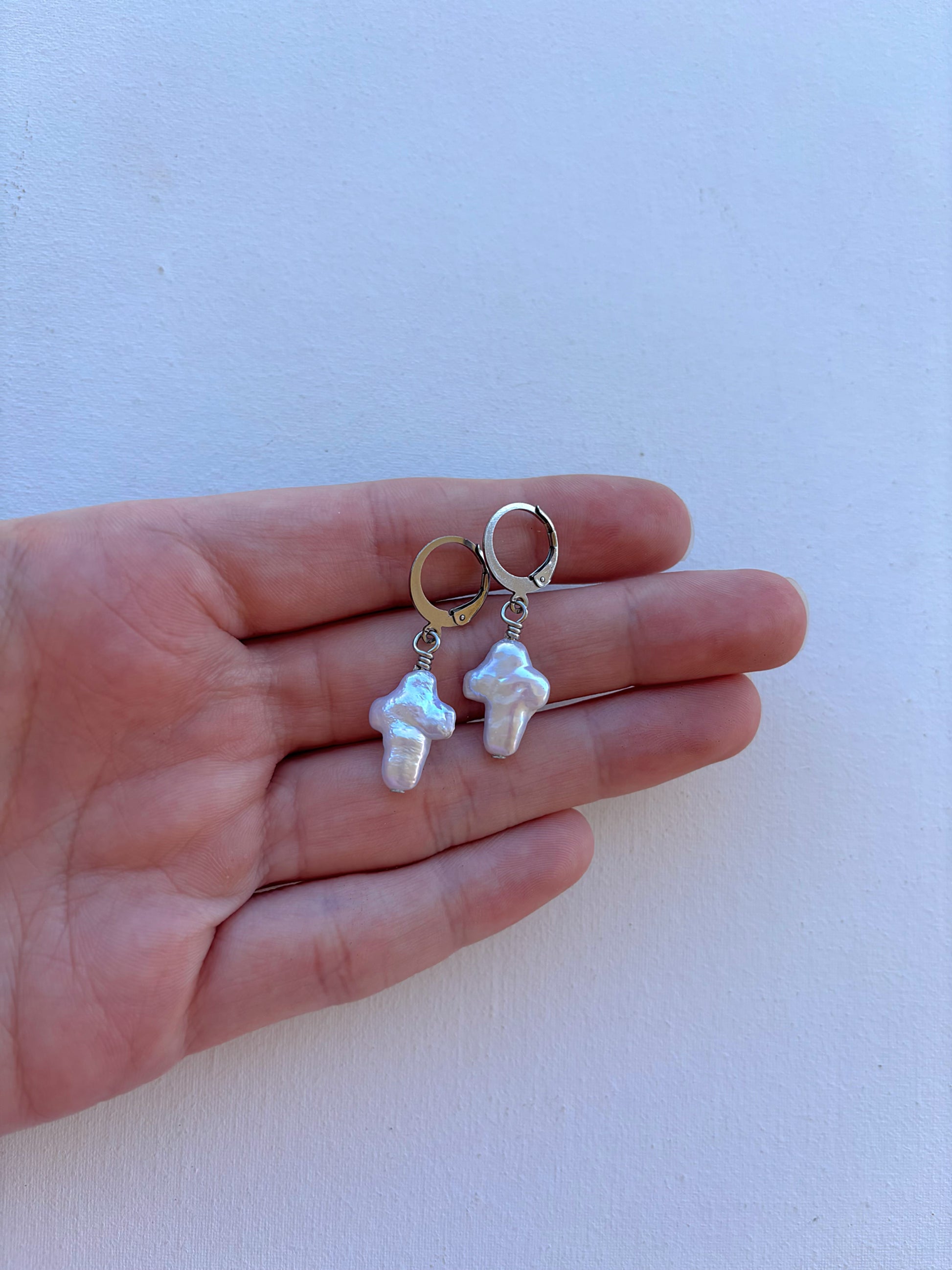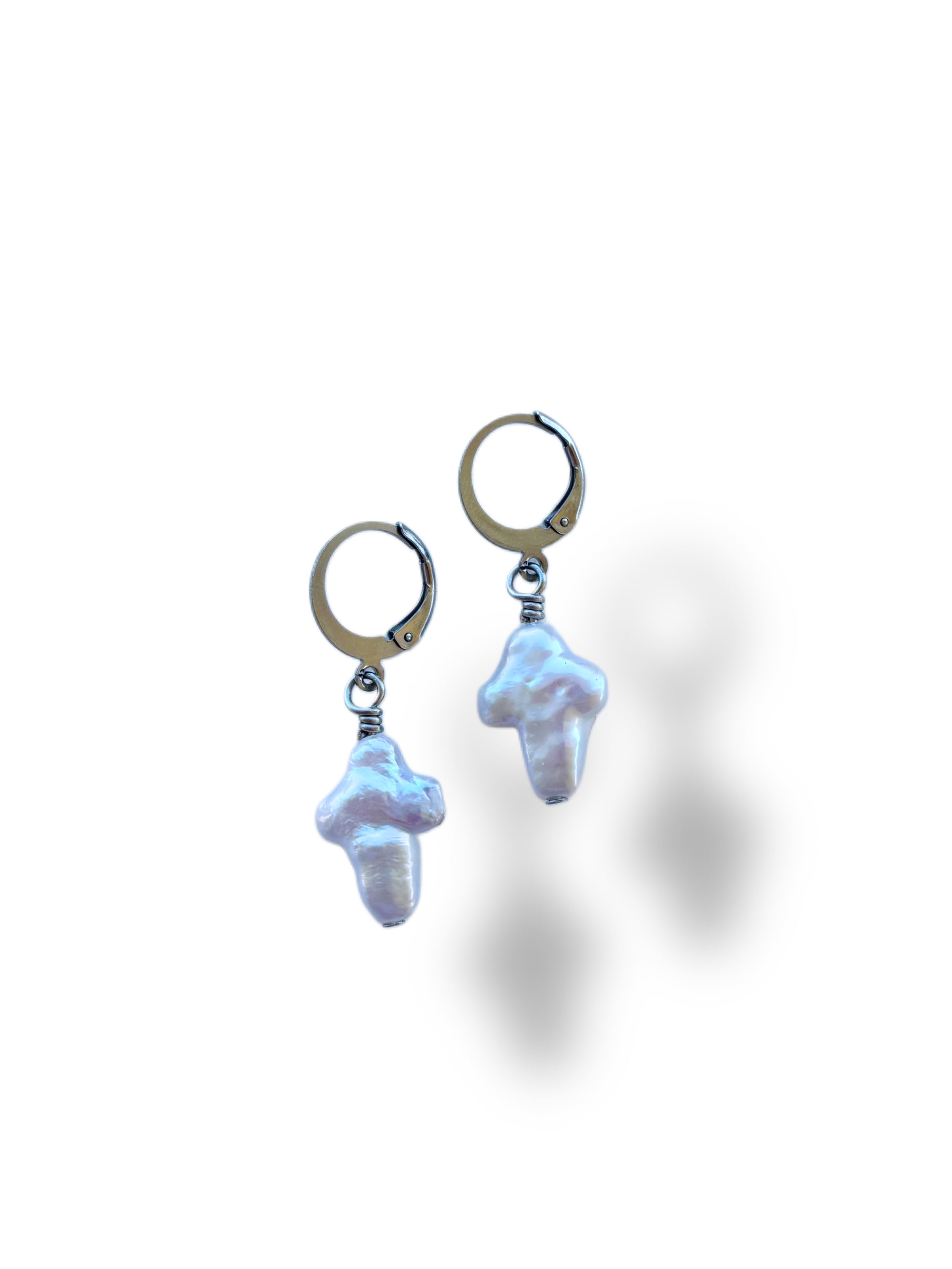 Freshwater Pearl cross on stainless steel huggie hoops. The pearl can vary in size & shape or have an “imperfect” cross look because the pearl forms naturally in an oyster this way! PLEASE see the last slide for how each pearl can look!