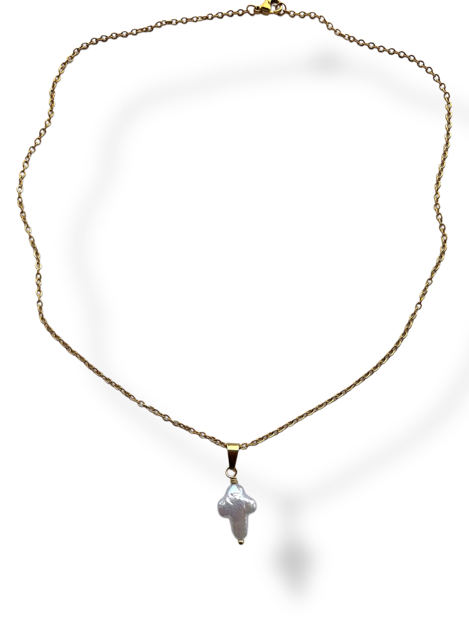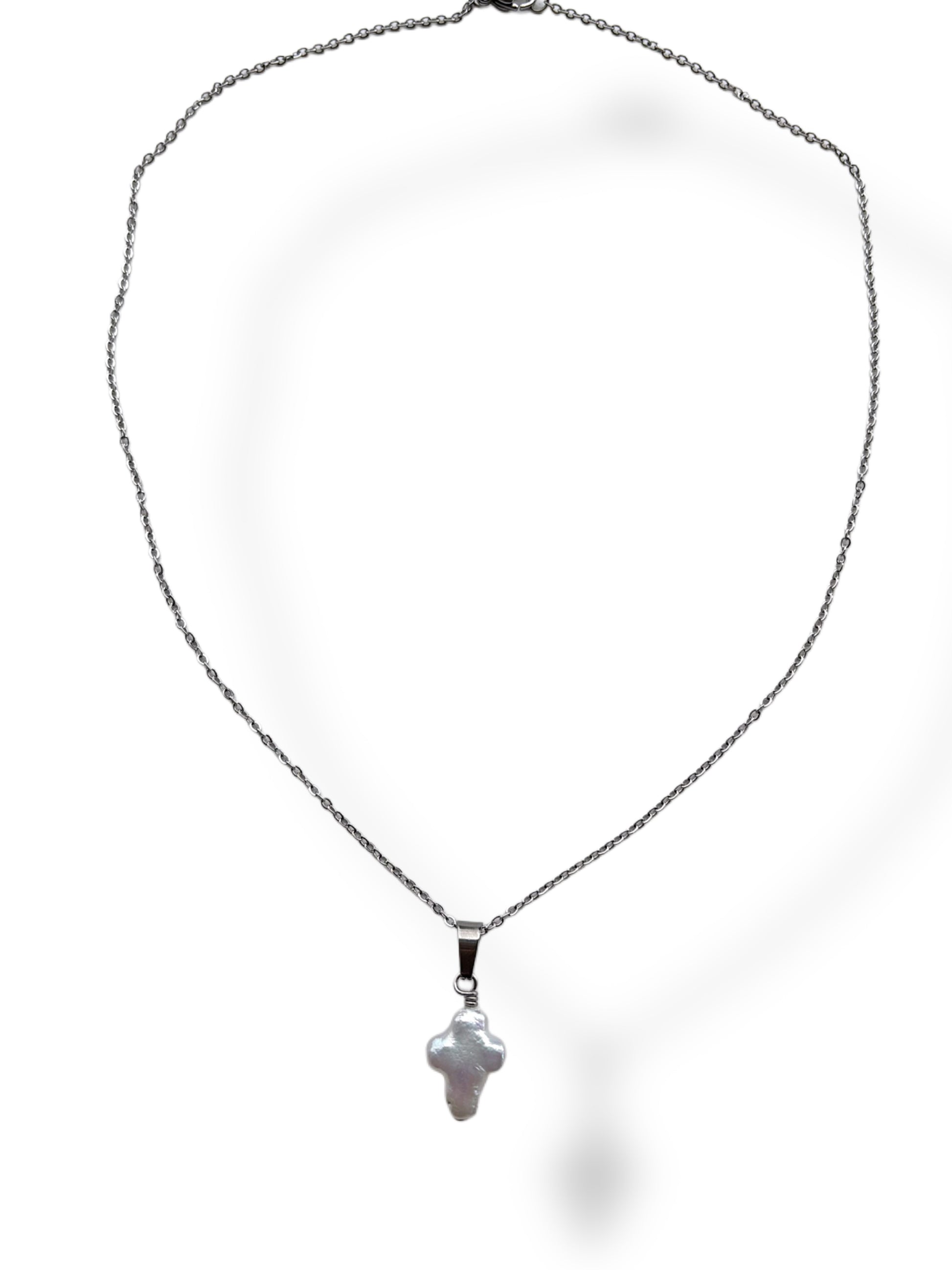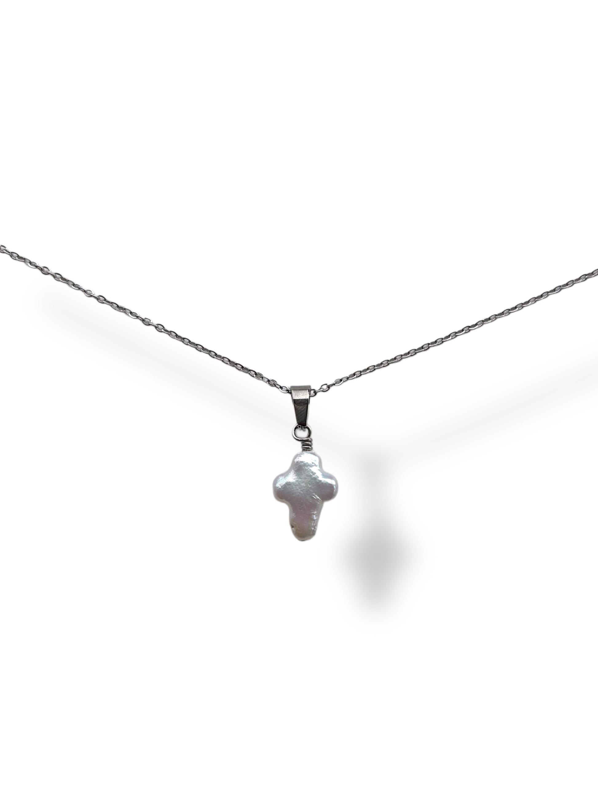 Freshwater pearl cross charm on stainless steel chain. The pearl can vary in size & shape or have an “imperfect” cross look because the pearl forms naturally in an oyster this way! PLEASE see the last picture in the slides for examples of the different ways the pearls can look!