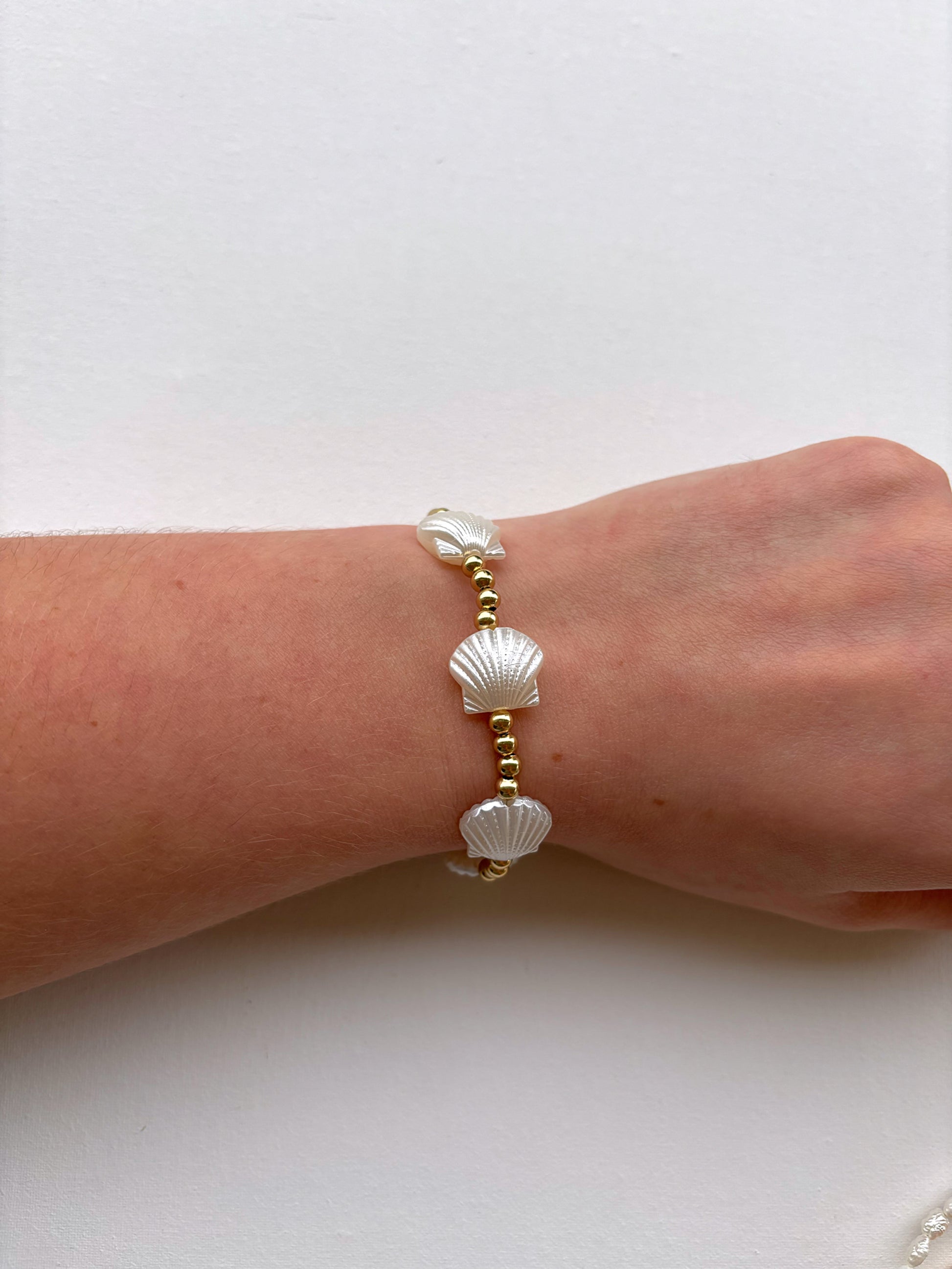 Yellow or white gold filled beads with stainless steel findings. Faux shell beads.
