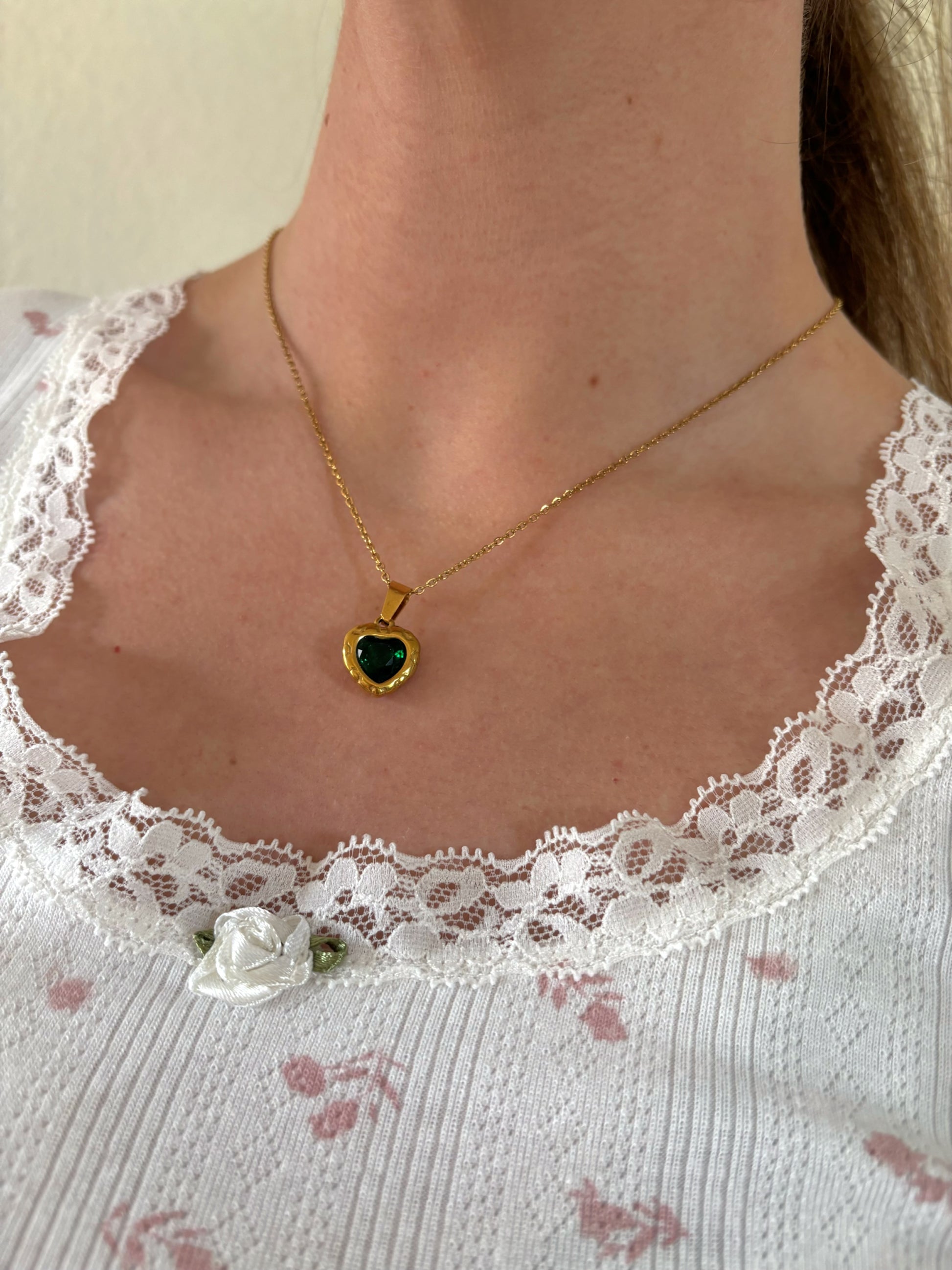 Vintage inspired emerald green Cubic Zirconia heart charm on stainless steel chain